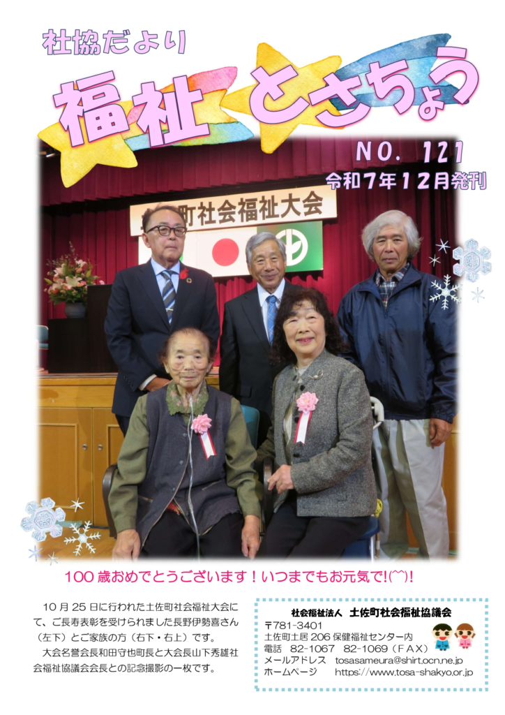 2025年12月16日 / 最終更新日時 : 2026年1月7日 tosasameura お知らせ 広報誌「福祉とさちょうNo.121」(令和7年12月発刊) コメントを残す コメントをキャンセルメールアドレスが公開されることはありません。 ※ が付いている欄は必須項目ですコメント ※ 名前 ※ メール ※ サイト 次回のコメントで使用するためブラウザーに自分の名前、メールアドレス、サイトを保存する。 Δ